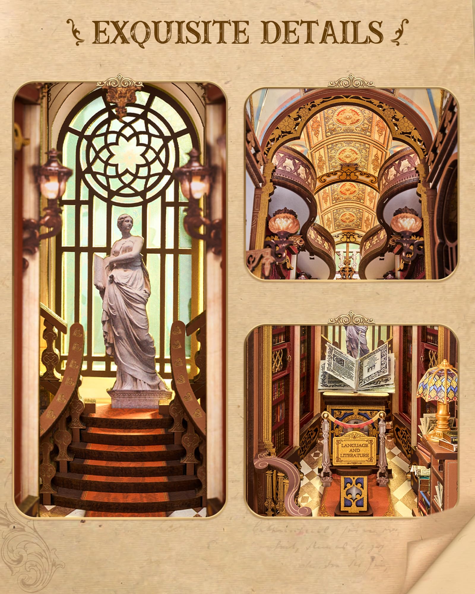 - 【Authentic Baroque Architecture in Miniature】This booknook is a true scale model, not just a flat scene. Build and admire genuine hall of knowledge: Roman columns, gilded reliefs trim, towering bookshelves that reach a vaulted ceiling, and a central classical statue. It's a piece of history and art, crafted by your own hands.